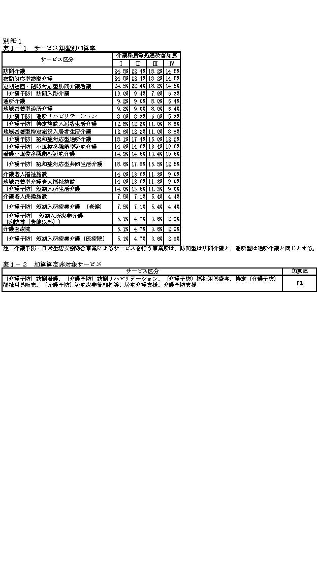 処遇改善加算の単位数として、サービス別の基本サービス費に各種加算減算(処遇改善加算を除く。)を加えた1月当たりの総単位数に、加算区分ごとに、別紙1表1-1に掲げるサービス類型別の加算率を乗じた単位数を算定する。また、別紙1表1-2のとおり、基準上介護職員が配置されていない、訪問看護、訪問リハビリテーション、居宅療養管理指導、福祉用具貸与、特定福祉用具販売、介護予防訪問看護、介護予防訪問リハビリテーション、介護予防居宅療養管理指導、介護予防福祉用具貸与及び特定介護予防福祉用具販売並びに居宅介護支援及び介護予防支援については、処遇改善加算の算定対象外とする。