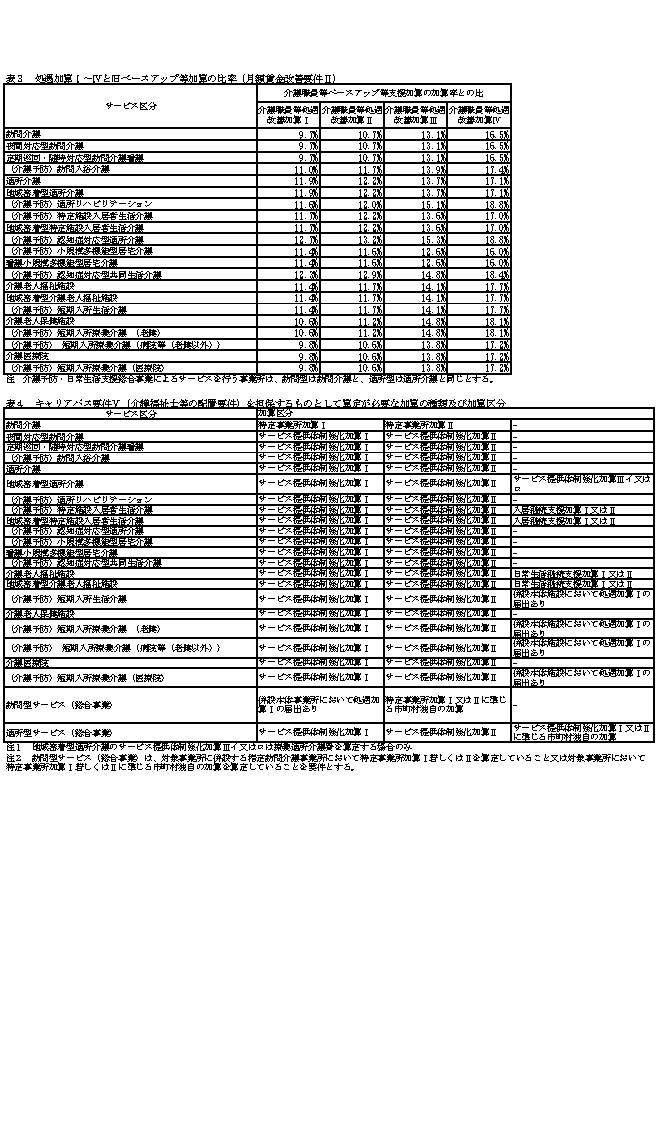 具体的には、旧3加算(介護職員処遇改善加算(以下「旧処遇改善加算」という。)、介護職員等特定処遇改善加算(以下「旧特定加算」という。)及び介護職員等ベースアップ等支援加算(以下「旧ベースアップ等加算」という。)をいう。以下同じ。)の各区分の要件及び加算率を組み合わせる形で、令和6年6月から「介護職員等処遇改善加算」(以下単に「処遇改善加算」という。)への一本化を行うとともに、加算率の引上げや配分方法の工夫を行った。