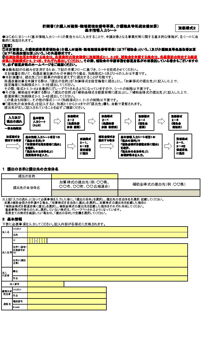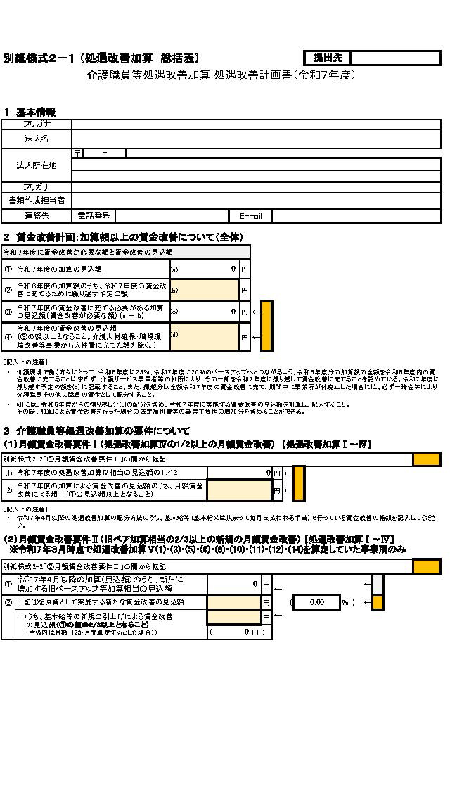 処遇改善加算の算定に当たっては、厚生労働大臣が定める基準(平成27年厚生労働省告示第95号。以下「大臣基準告示」という。)第4号イ⑵等に規定する介護職員等処遇改善計画書を、別紙様式2-1及び別紙様式2-2に定める様式により作成し、当該事業年度において初めて処遇改善加算を算定する月の前々月の末日までに、処遇改善加算を算定する介護サービス事業所等の所在する都道府県知事等に対して提出し、根拠資料と併せて2年間保存することとする。なお、確認の事務に要する時間が十分確保できる場合等において、都道府県知事等は処遇改善計画書の提出期日を延長しても差し支えない。