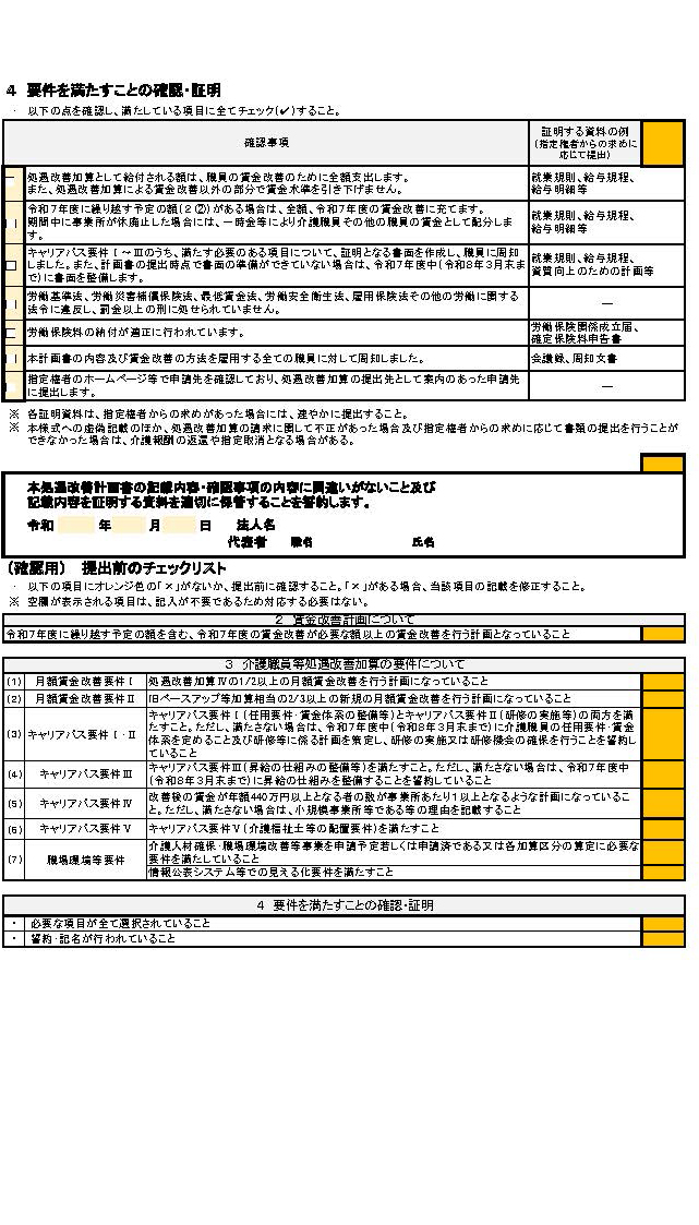 なお、令和7年4月から新規に処遇改善加算を算定し始める場合又は処遇改善加算の区分を変更する場合の体制届出の期日は、居宅系サービス及び施設系サ-ビスのいずれにおいても令和7年4月1日とする。ただし、下記⑵のとおり、処遇改善計画書の届出期日が令和7年4月15日であることを踏まえ、都道府県知事等は、処遇改善加算に係る体制届出の期日を令和7年4月15日としても差し支えない。また、体制届出の期日を令和7年4月1日とする場合であっても、都道府県知事等は、令和7年4月15日までの間に介護サービス事業者等が届け出た処遇改善加算の算定区分の変更等を受け付ける等、柔軟な取扱いとすること。