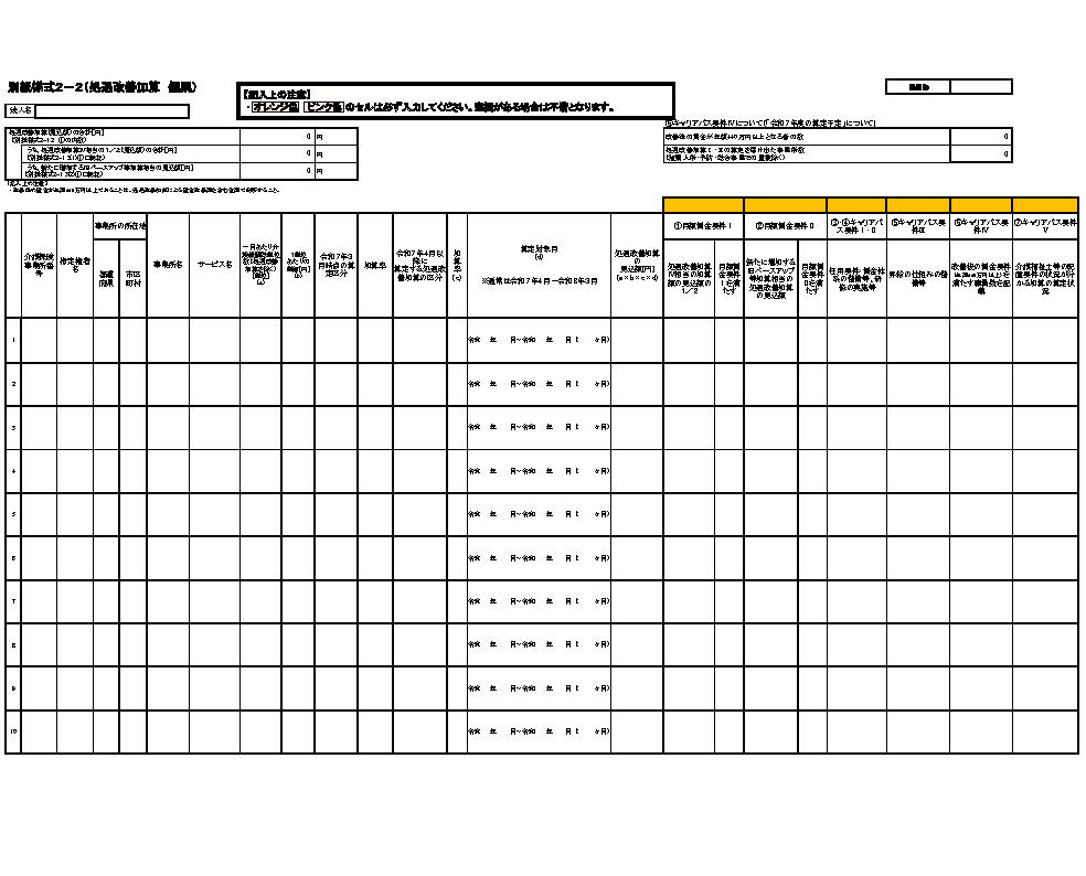 ② 複数の介護サービス事業所等について一括して申請を行う事業者において、当該申請に関係する介護サービス事業所等に増減(新規指定、廃止等の事由による。)があった場合は、変更届出書並びに別紙様式2-1の2、3⑴、⑵及び⑸並びに別紙様式2-2を提出すること。