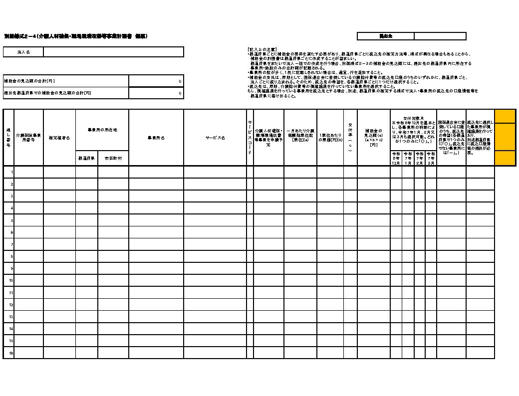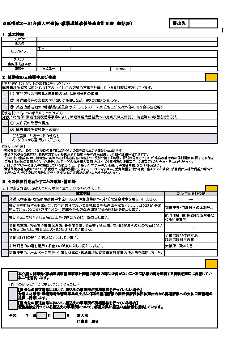 複数の介護サービス事業所等を有する介護サービス事業者等については、別紙様式2及び3の処遇改善計画書等について、事業者(法人)単位で一括して作成して差し支えない。