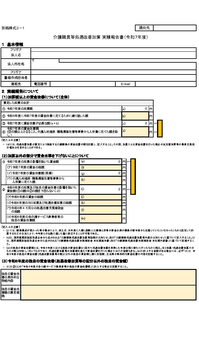 処遇改善加算を算定した介護サービス事業者等は、大臣基準告示第4号イ⑷等に規定する実績の報告を、別紙様式3-1及び別紙様式3-2に定める様式により作成の上、各事業年度における最終の加算の支払があった月の翌々月の末日までに、都道府県知事等に対して提出し、根拠資料と併せて2年間保存することとする。