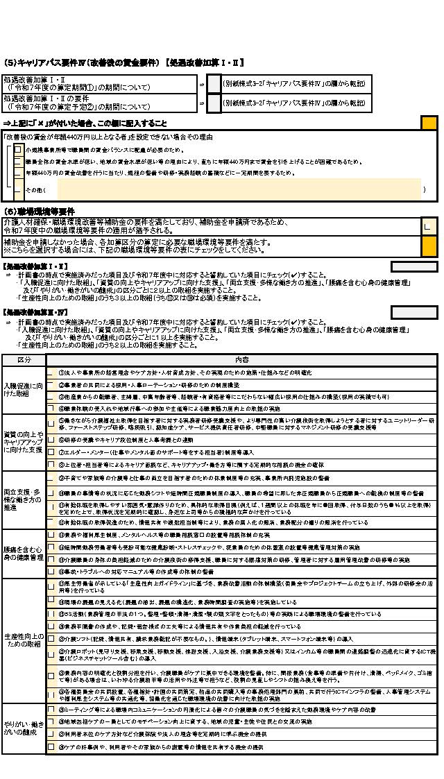 ④ キャリアパス要件Ⅴ(介護福祉士等の配置要件)に関する適合状況に変更があり、算定する処遇改善加算の区分に変更が生じる場合は、介護福祉士等の配置要件の変更の内容を変更届出書に記載し、別紙様式2-1の3⑹及び別紙様式2-2を提出すること。