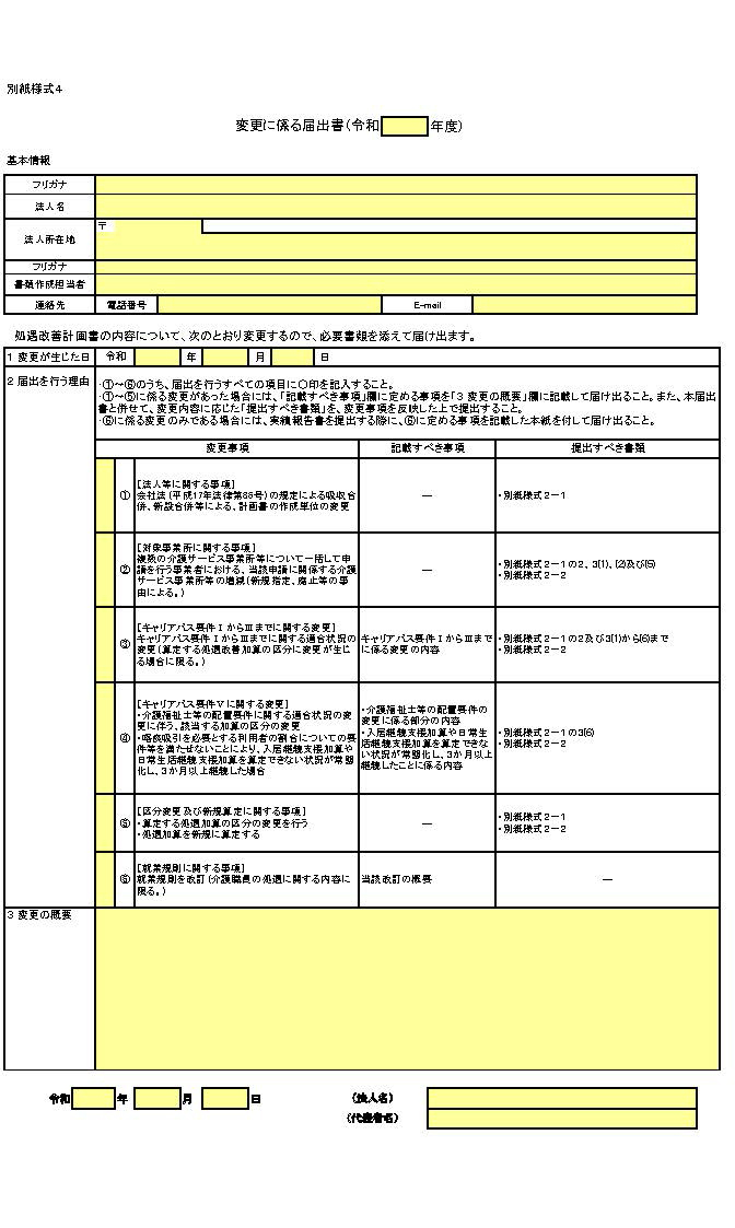 介護サービス事業者等は、処遇改善加算を算定する際に提出した処遇改善計画書の内容に変更(次の①から⑤までのいずれかに該当する場合に限る。)があった場合には、次の①から⑤までに定める事項を記載した別紙様式4の変更に係る届出書(以下「変更届出書」という。)を届け出ること。