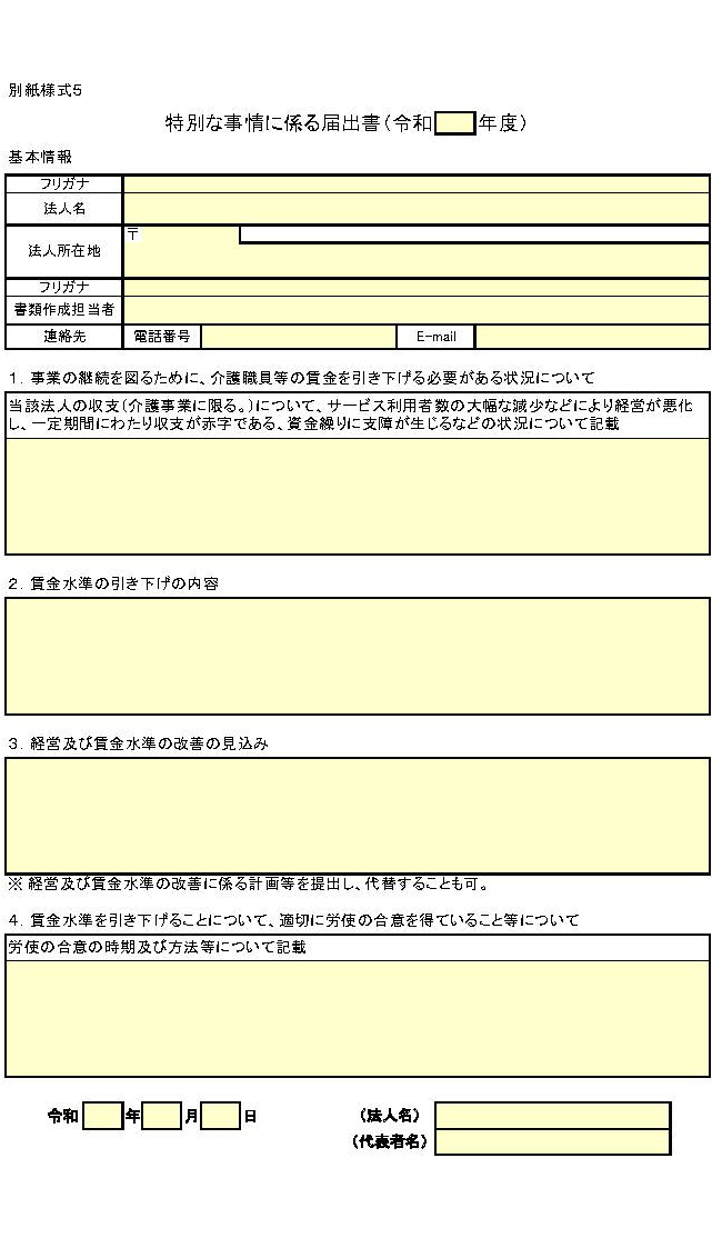 事業の継続を図るために、職員の賃金水準(処遇改善加算による賃金改善分を除く。以下この5において同じ。)を引き下げた上で賃金改善を行う場合には、以下の①から④までの事項を記載した別紙様式5の特別な事情に係る届出書(以下「特別事情届出書」という。)を届け出ること。なお、年度を超えて介護職員の賃金を引き下げることとなった場合は、次年度の加算を算定するために必要な届出を行う際に、特別事情届出書を再度提出する必要がある。